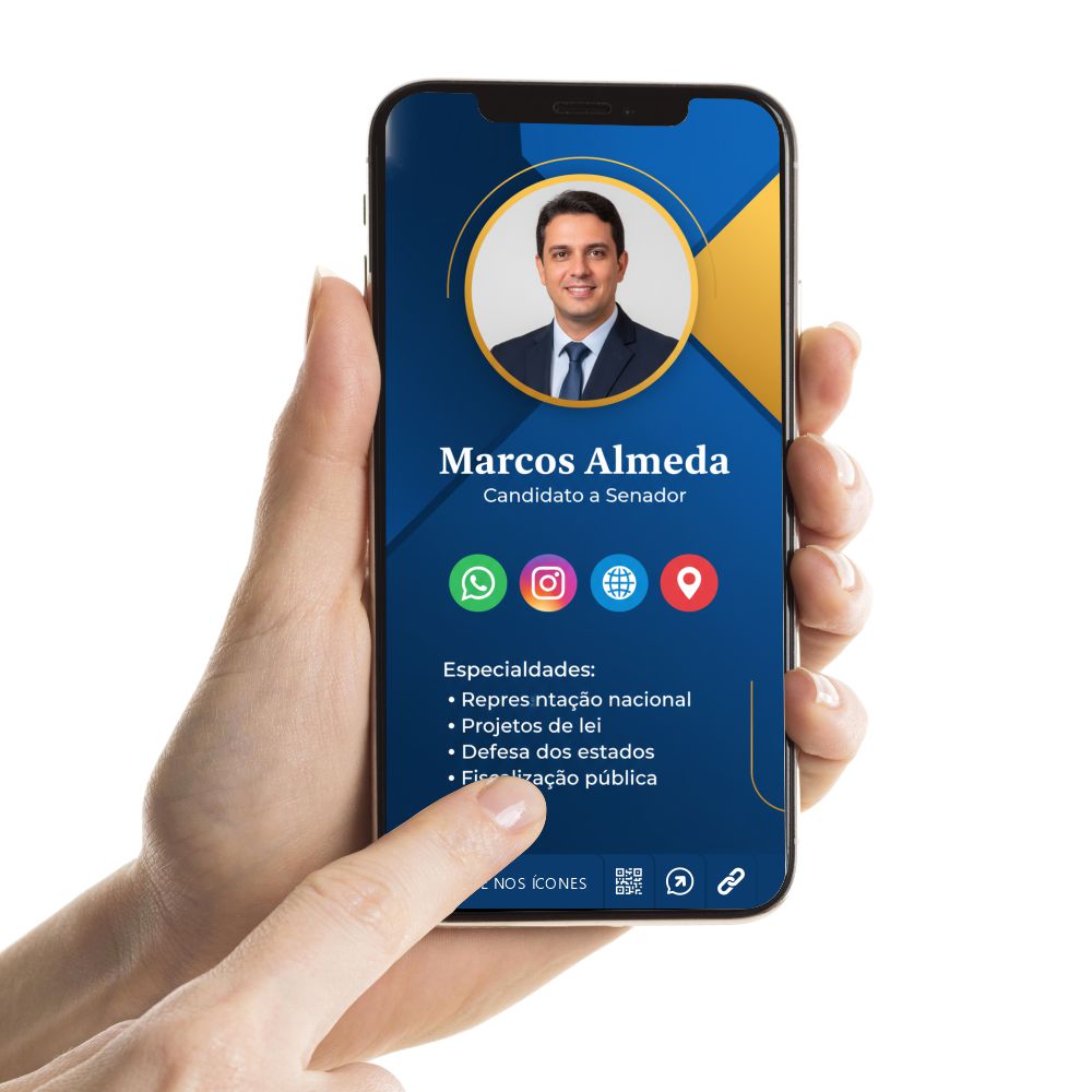 Cartão de Visita Digital, Político, Cartão de Visita Digital Candidato a Senador é um cartão de visitas 100% digital e interativo, pode ser personalizado com todas as suas informações e/ou de sua empresa. Tornando seus contatos mais rápidos, dinâmicos, eficientes e sem erros de digitação. Pode enviar pelo WhatsApp ou e-mail para seus contatos e amigos a qualquer momento.